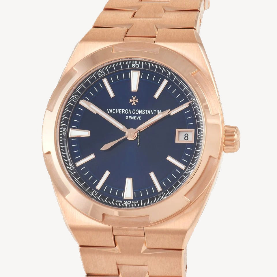 The Vacheron Constantin Overseas Rose Gold Automatic Watch 4500V/110R-B705 is one elegant, functional, and versatile timepiece. It features a rose gold case and bracelet paired with a dazzling azure dial. The 41 mm case is slim and sporty yet still dressy. It bears a scratch-resistant sapphire crystal on its front face and back.