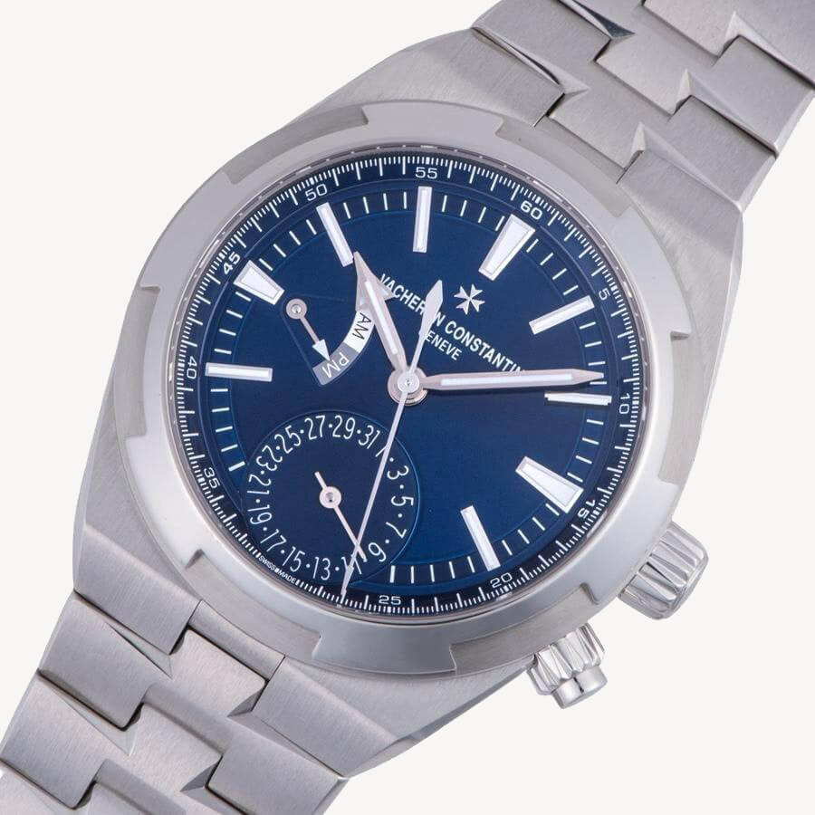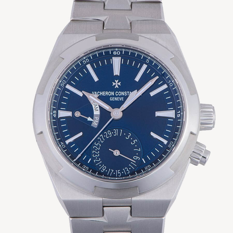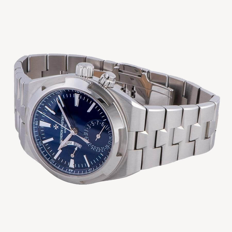Discover the stainless-steel Vacheron Constantin Overseas Dual Time 7900V, a traveler's essential. This watch offers a dual time zone with a day-night indicator and date hand, simplifying your journeys. It features the coveted early release blue lacquer dial which gives this watch stunning richness in blue depth tones.