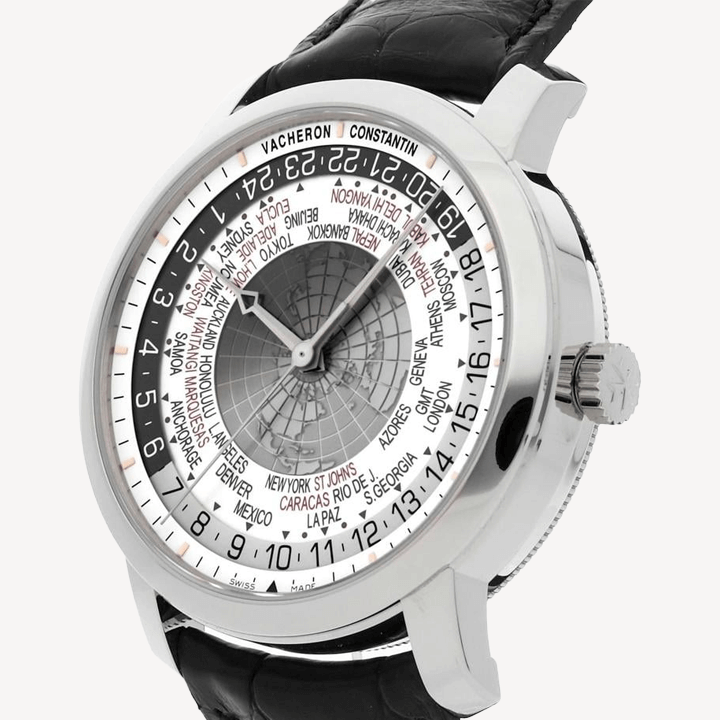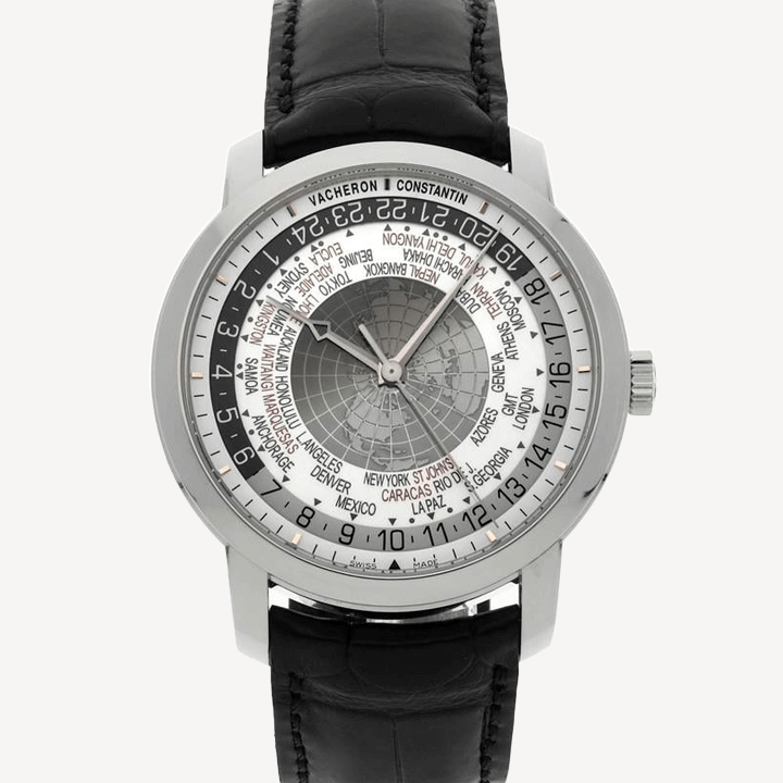 18 carat white gold case with a black alligator leather strap. Silver dial with silver-tone hands. Dial Type: Analog. Vacheron Constantin Calibre 2460 WT automatic movement with about 40 hours of power reserve. Scratch resistant sapphire crystal. Pull / push crown. Skeleton transparent exhibition see through case back. Case size: 42.50 mm. Case thickness: 11.62 mm. Round case shape. Deployant clasp. Water resistant at 30 meters / 100 feet. Functions: hour, minute, second, world time, day and night indicator. Luxury watch style.