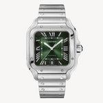 An extra modern and cool version of a true classic - take a look at this Santos de Cartier WSSA0062. The watch features a striking smoky green dial that displays a lighter and brighter green tone at the center, gradually darkening in tone as it moves toward the outer perimeter.
