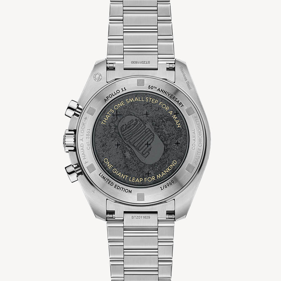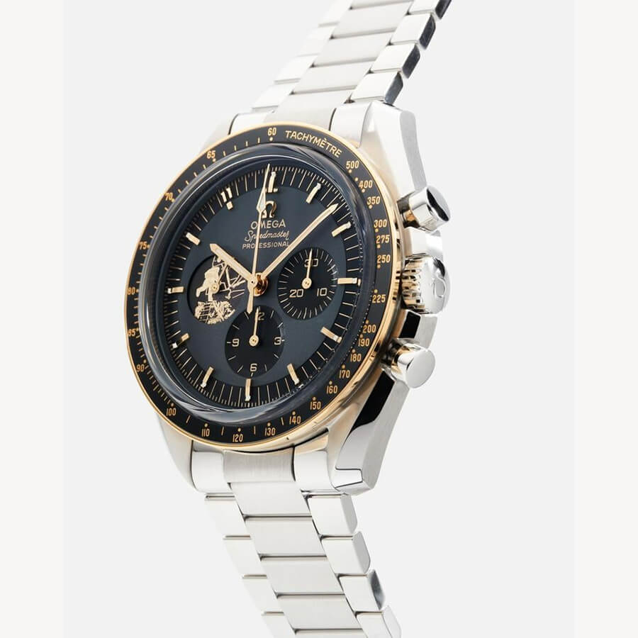 Ceasul dispune de o carcasă de 42 mm din oțel inoxidabil, cu o lunetă lustruită din aur Moonshine™ de 18K. Inelul lunetei este realizat din ceramică neagră lustruită [ZrO2], cu o scară tahimetrică OMEGA Ceragold™. Cadranul gri și negru lăcuit include indexuri și mâini din aur Moonshine™ de 18K, cu excepția secundarului central al cronografului, acoperit cu PVD în aur Moonshine. La ora 11 se află un marcator orar unic, iar la ora 9 se găsește un subcadran distinctiv din aur Moonshine™ de 18K, cu o imagine gravată cu laser a lui Buzz Aldrin pășind pe suprafața lunii.